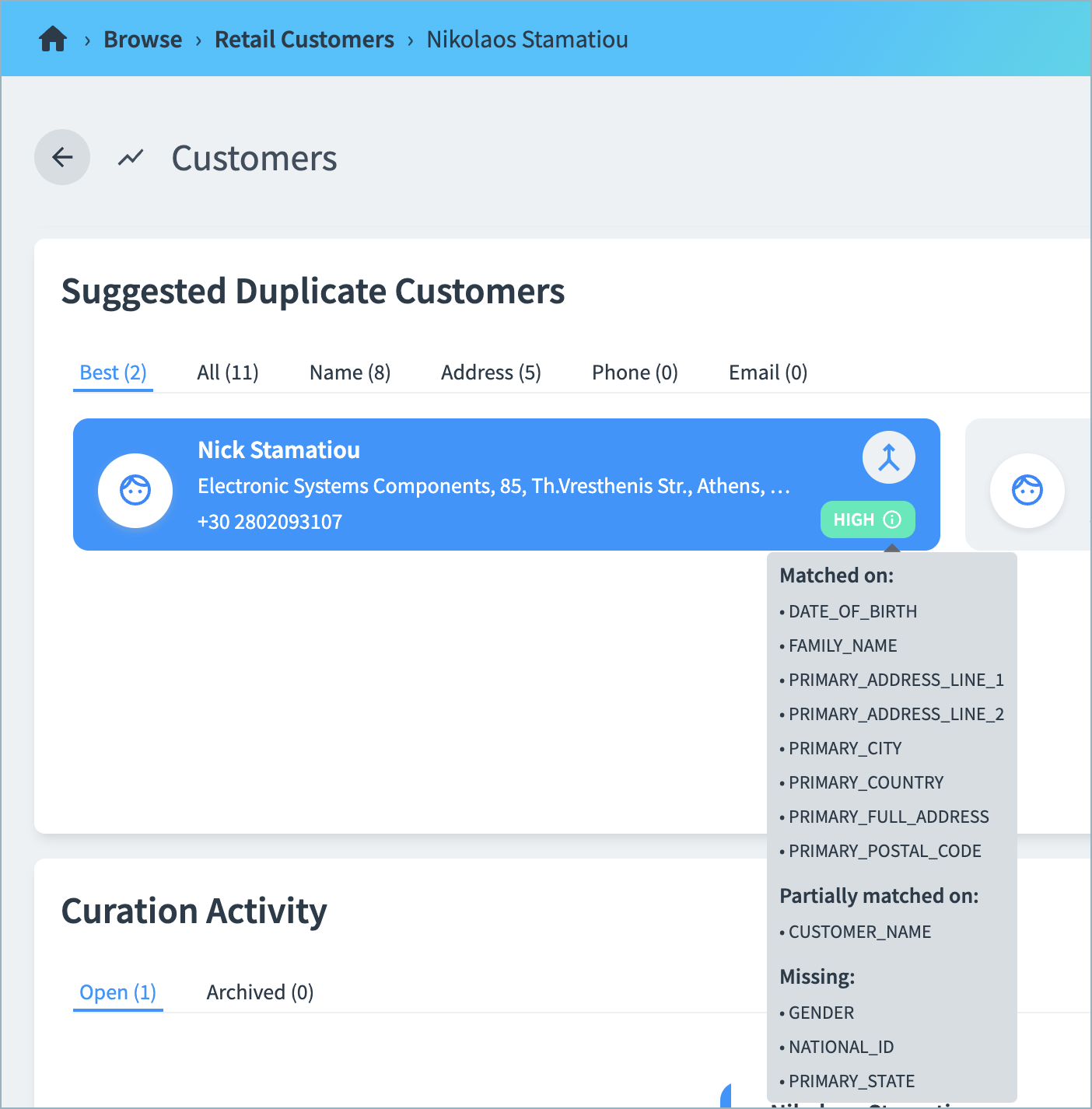 For data products using a System of Record, the 360 view pages now include the match confidence for each suggested duplicate record (high, medium, or low). Select the confidence label on the suggested duplicate record to view which fields match and partially match between the records.