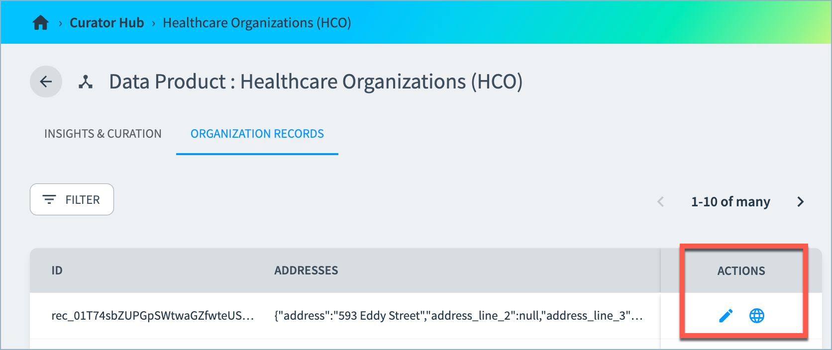 From the Actions column, select the Edit (pencil) option to transition immediately to the record edit page, or the 360 (globe) option to open the record’s 360 view page.