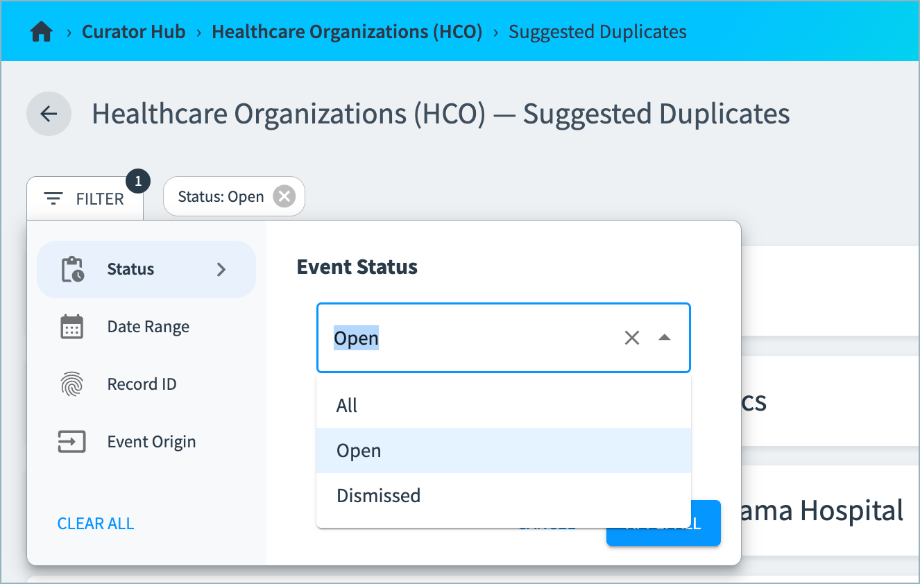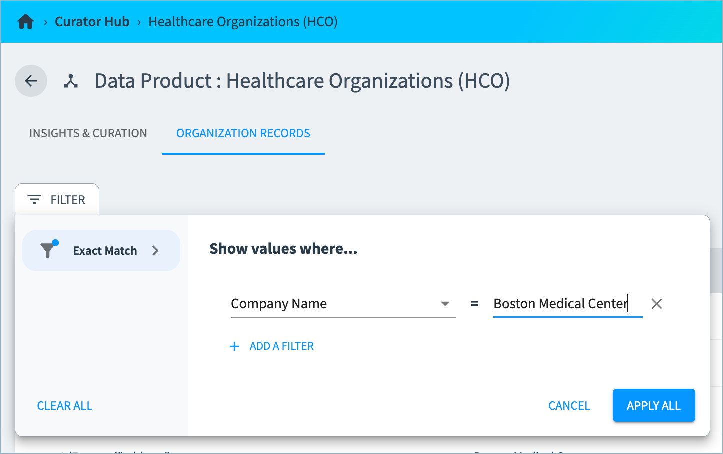 In Curator Hub, you can now filter the golden records table to quickly locate specific records in the System of Records. Find the records that exactly match specified values for one or more selected attributes. Note that match is case-sensitive.