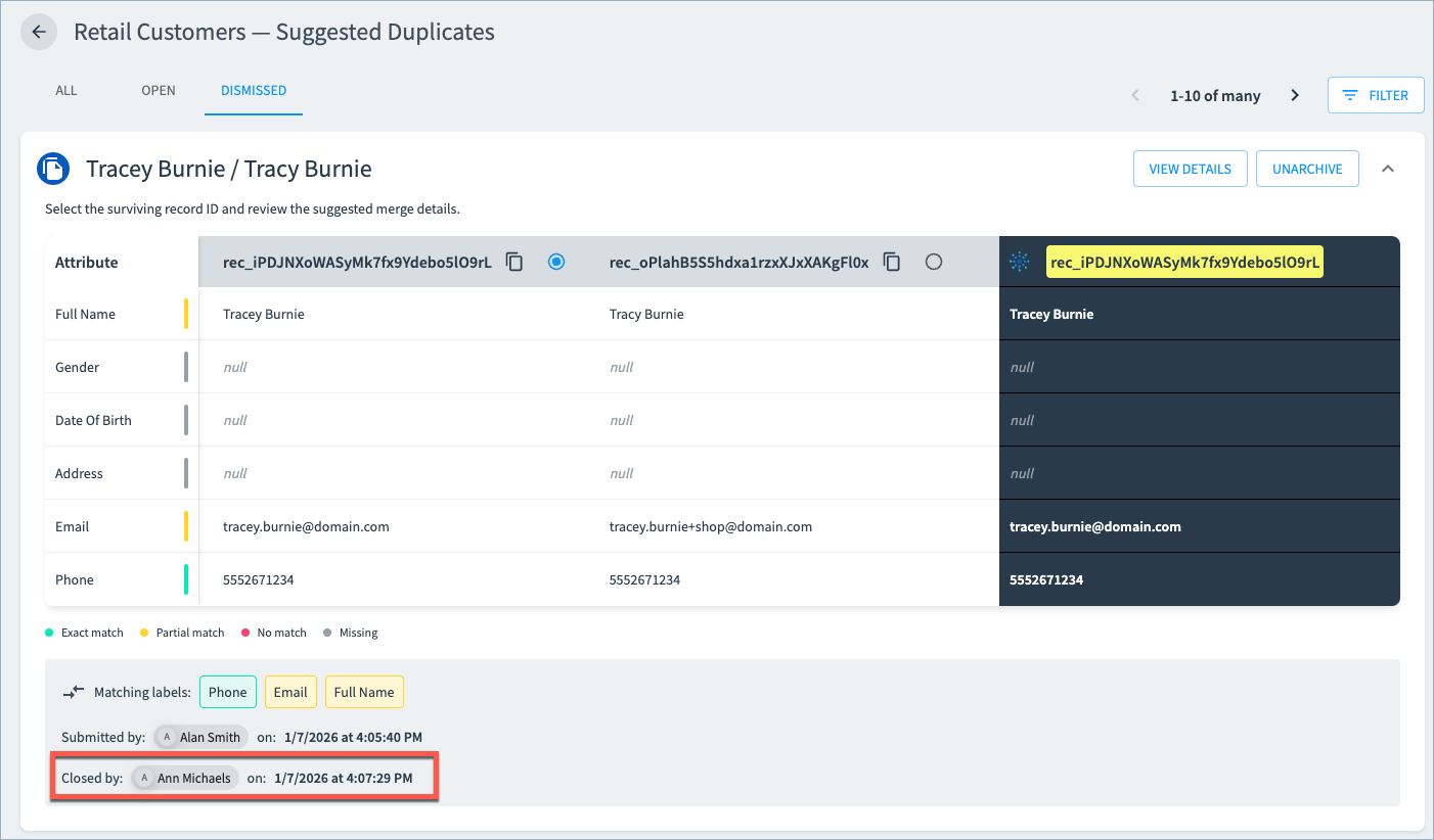 For the Suggested Duplicates queue, users close items by either merging the suggested records or dismissing the suggestion. For the Suggested Edits queue, users close items by either committing the suggested value change or dismissing the suggestion.