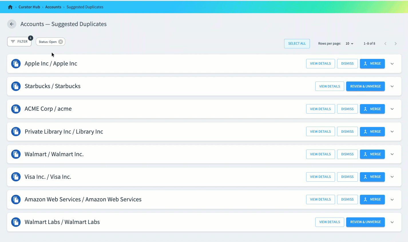 In Curator Hub, you can now dismiss multiple events in your curation queues at once. As shown below, you can select several events or all events listed on the page and dismiss (close) them in a single action.