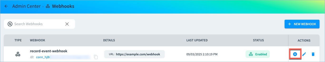 If you are using webhooks for event notifications, you can pause (disable) webhooks on the Webhooks page in the Admin Center. This is useful, for example, to avoid sending a large number of record events to the webhook when testing a configuration change.