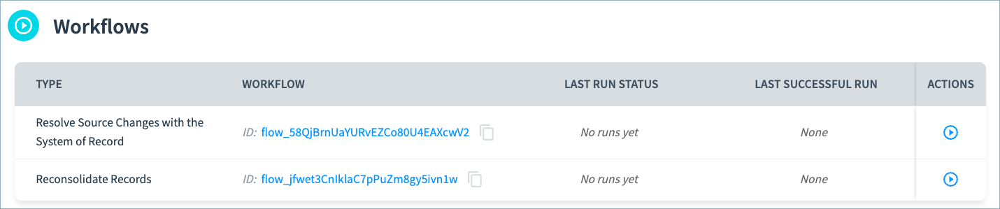 | Reconsolidate Records | This workflow re-evaluates all source records currently linked to a golden record and applies your record consolidation logic to determine the surviving values for every attribute in a golden record. | After editing record consolidation rules to update values in your golden records.