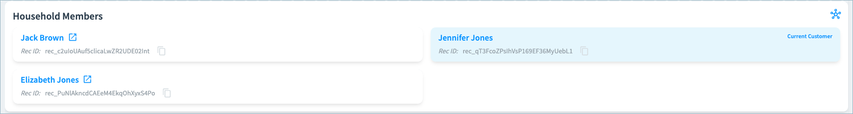 If you are using a B2C Customers data product and have configured Householding, Household relationships also appear on the 360 View page as a separate Household Members tile.