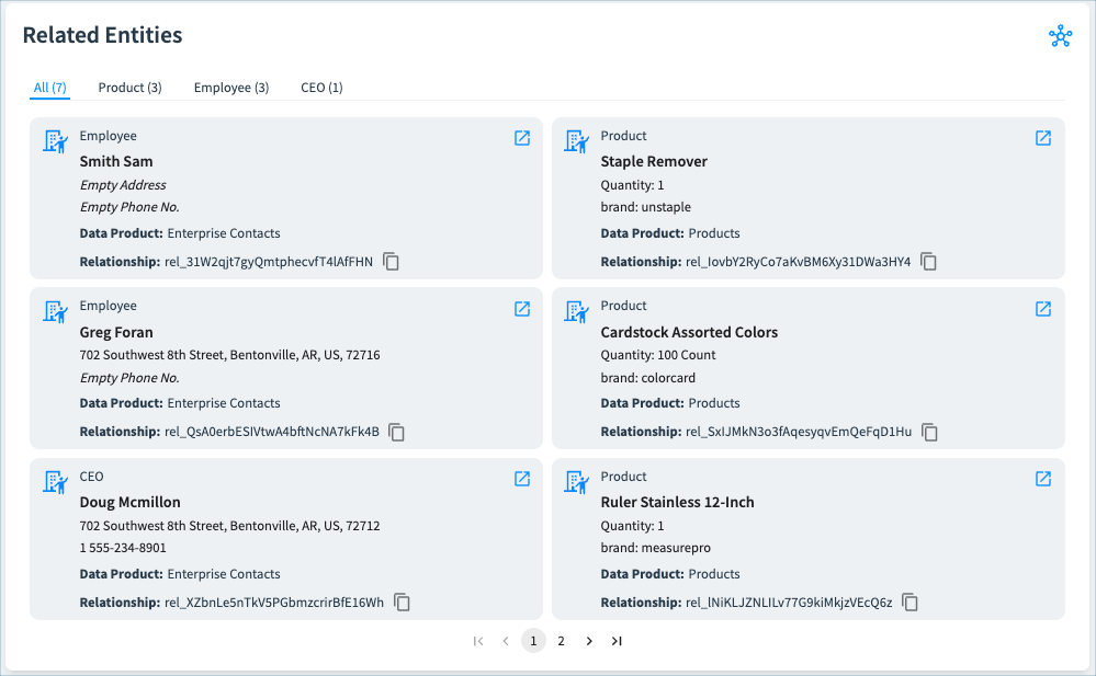 The relationships you configure between records are shown in the Related Entities section of the 360 View pages. This section includes a tab for each type of relationship you have defined for records in the data product, and includes links to the related records.