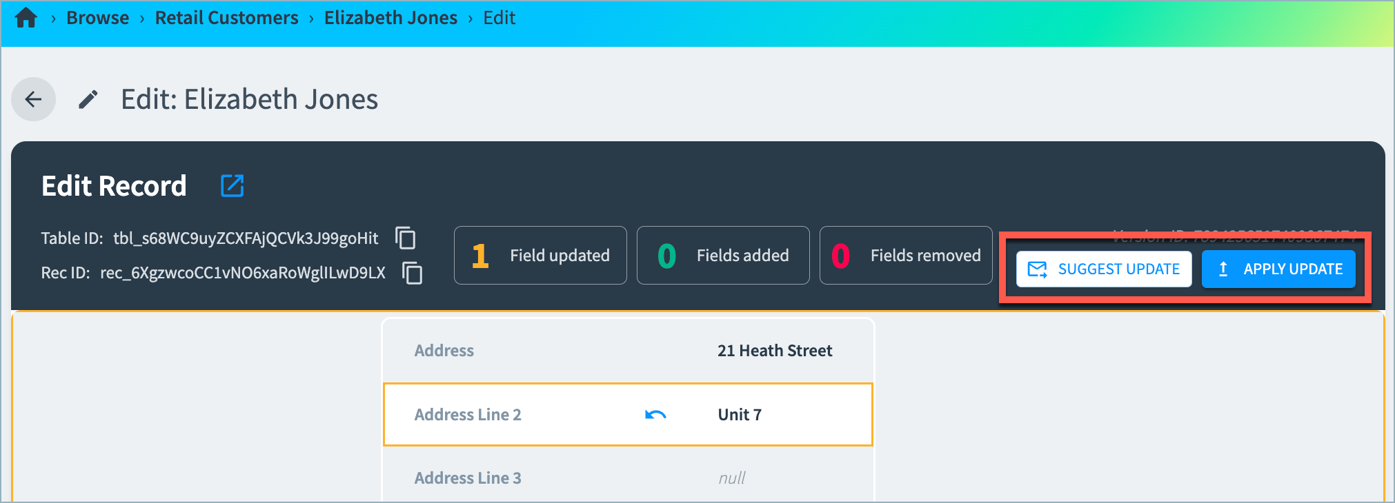 Select Apply Update to update the record immediately with the new value. This change is shown in the record history on the 360 page.