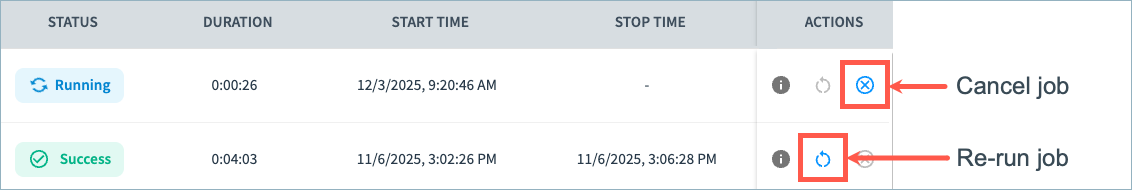 You can also cancel jobs in progress and re-run jobs from this page.