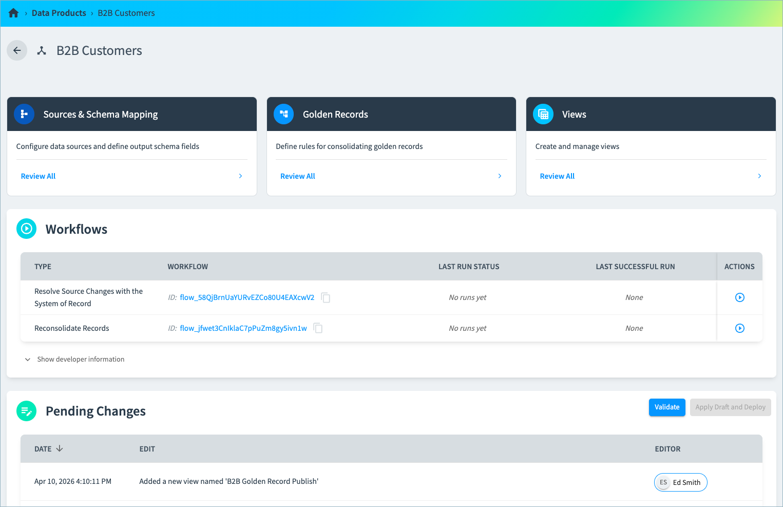 You can perform both incremental updates to the SOR through data product workflows and individual record updates using the record APIs and curation tools - making it easy to add records in bulk from a new data source while creating and updating individual records in real-time.