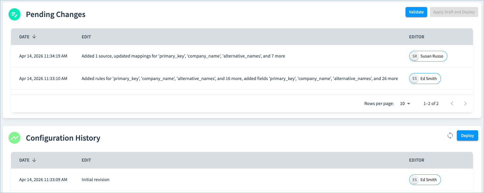 The configuration UI facilitates collaborative data product configuration. Data product developers use a new draft and deployment process to apply configuration changes. All changes are available in the configuration history, providing detailed insight into changes over time.