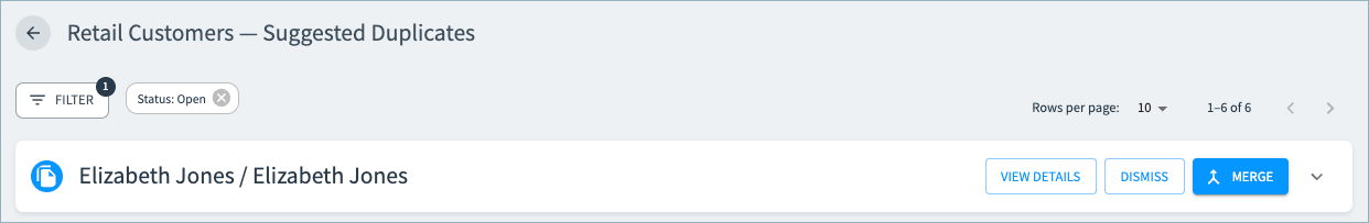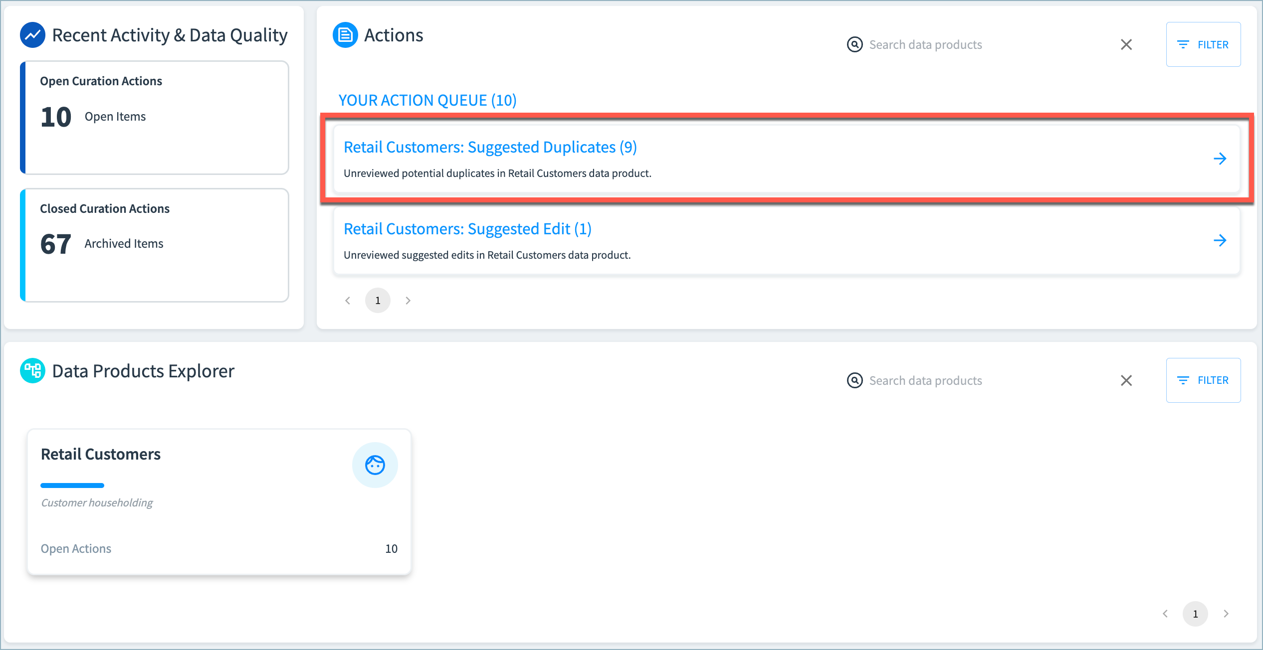 Open a suggested duplicates queue from the Actions section. If your organization has a large number of data products, you can search for a queue for a specific data product filter to a specific data product type.