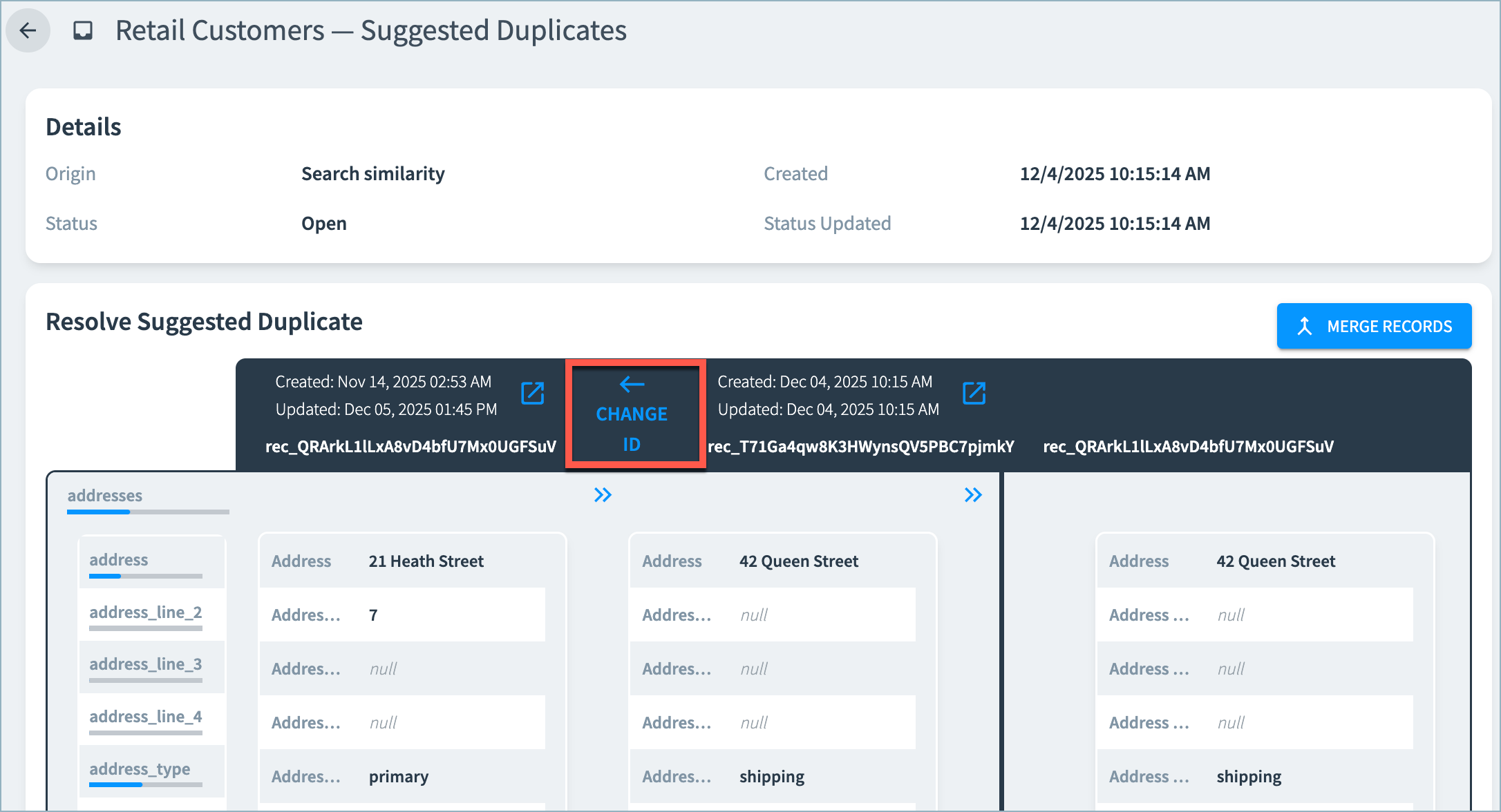 - Select which record to retain after the merge by toggling the Change ID option. The column on the right provides a preview of the record after the merge.
