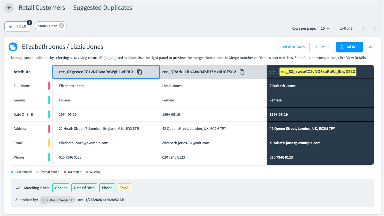 If you need to review the full record details to determine if they should merge, select View Details to open a pairwise comparison of all attributes for these two records.
