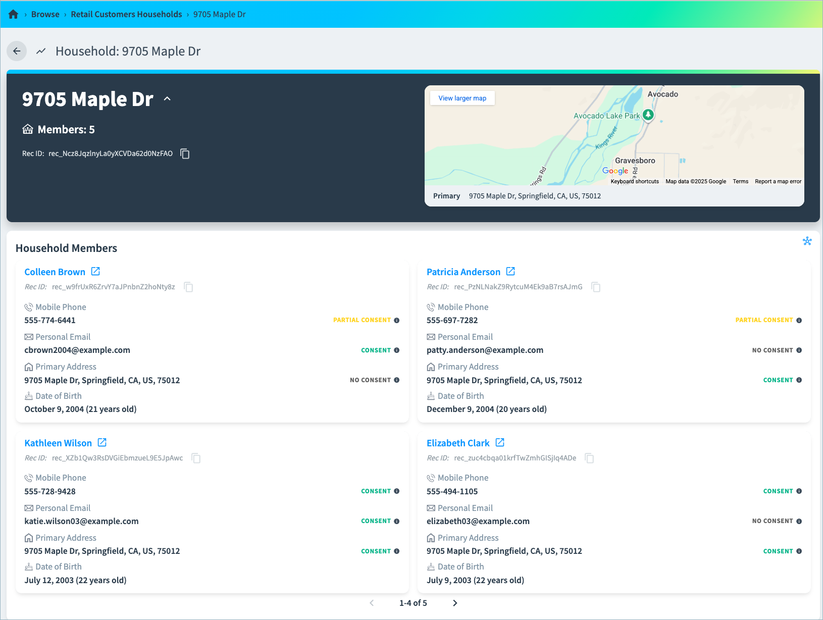 The Household 360 page provides a complete view of household members, shared attributes such as address or phone number, and household history.