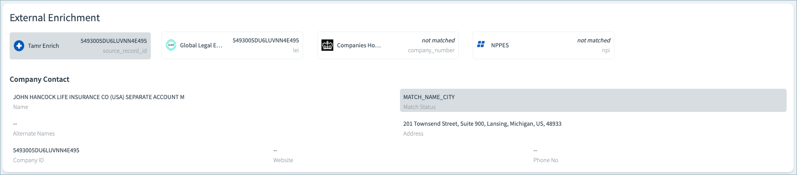 - Site Level: The company name and full street address have been confidently matched against Tamr's firmographic corpus, verifying the company at this specific site.