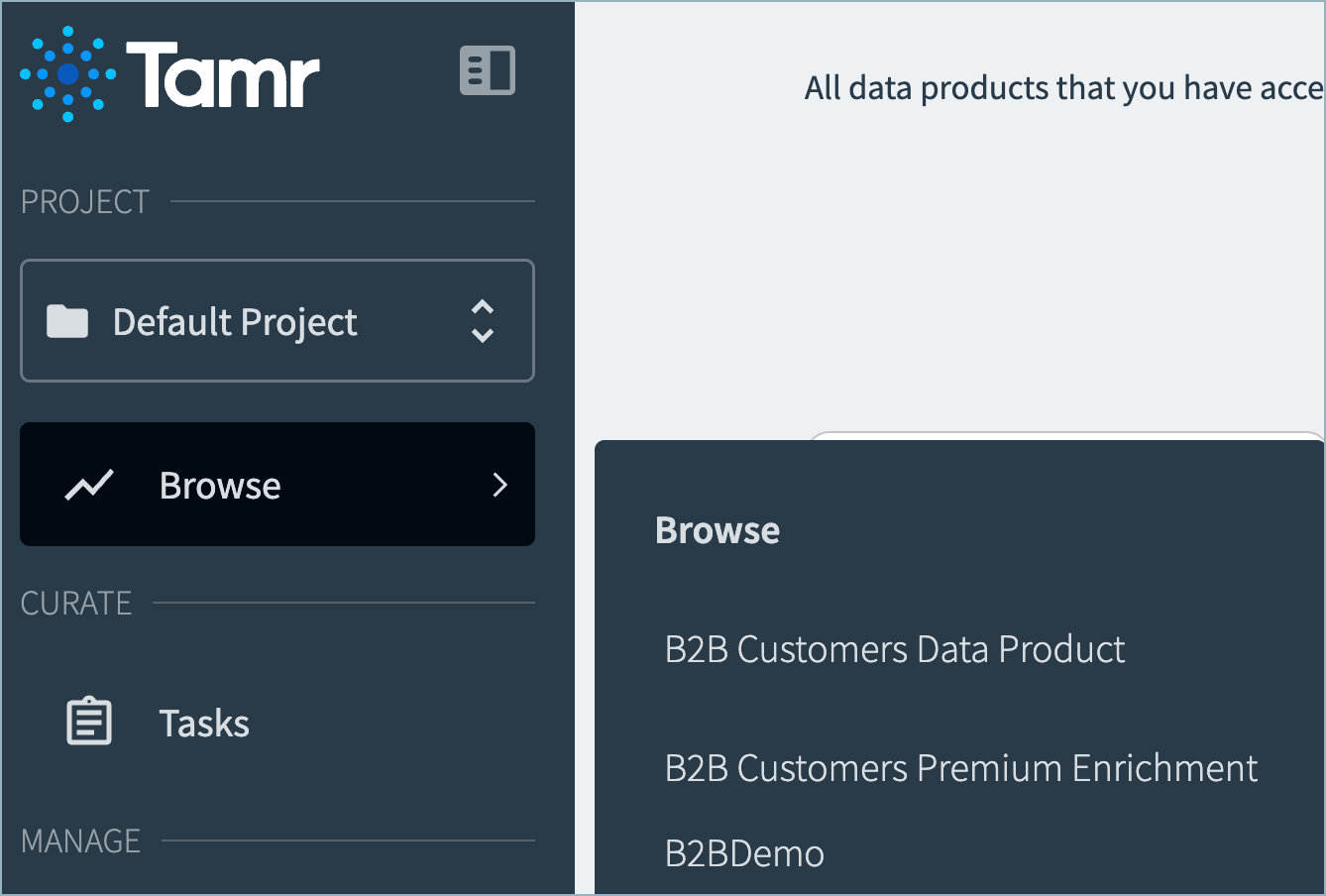 Access 360 pages for your data products from the Browse option in the left navigation menu. Select your data product to browse or search for a record. You can search using a fuzzy or exact match on attribute values.