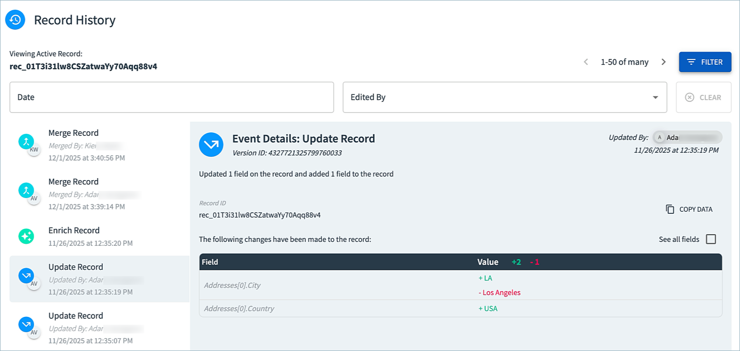 Record History: In the Record History section, you can review all updates to this record over time, including the type of change, user who made the change, and change details. You can filter record events by date range and user.